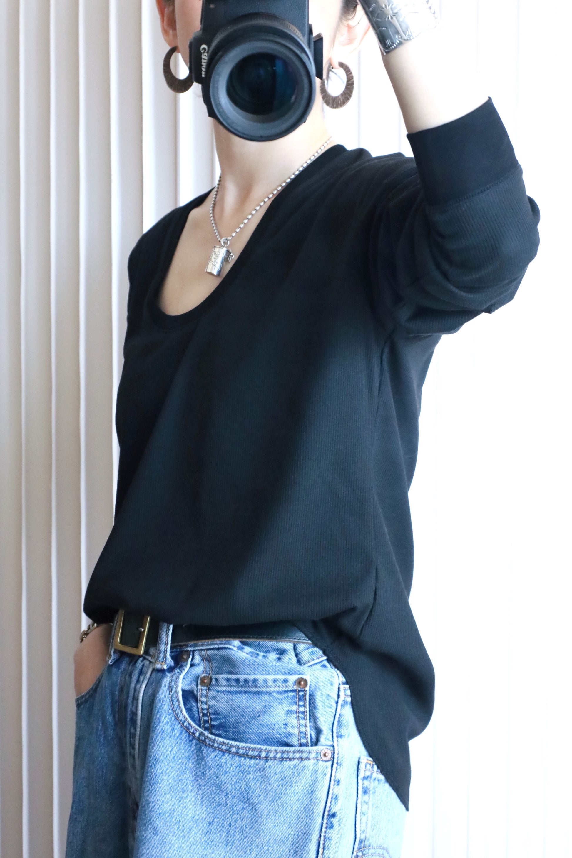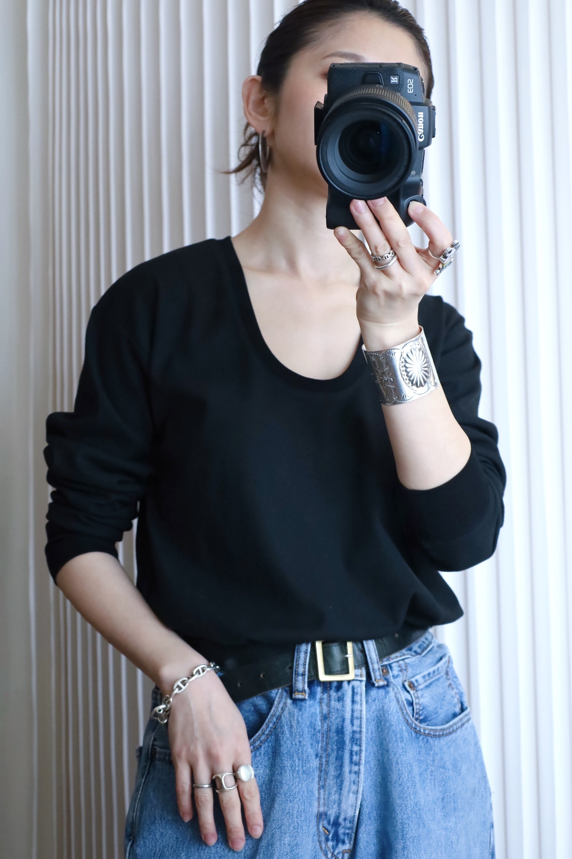 シンプルでありながら、首元のラインだけで印象が変わり