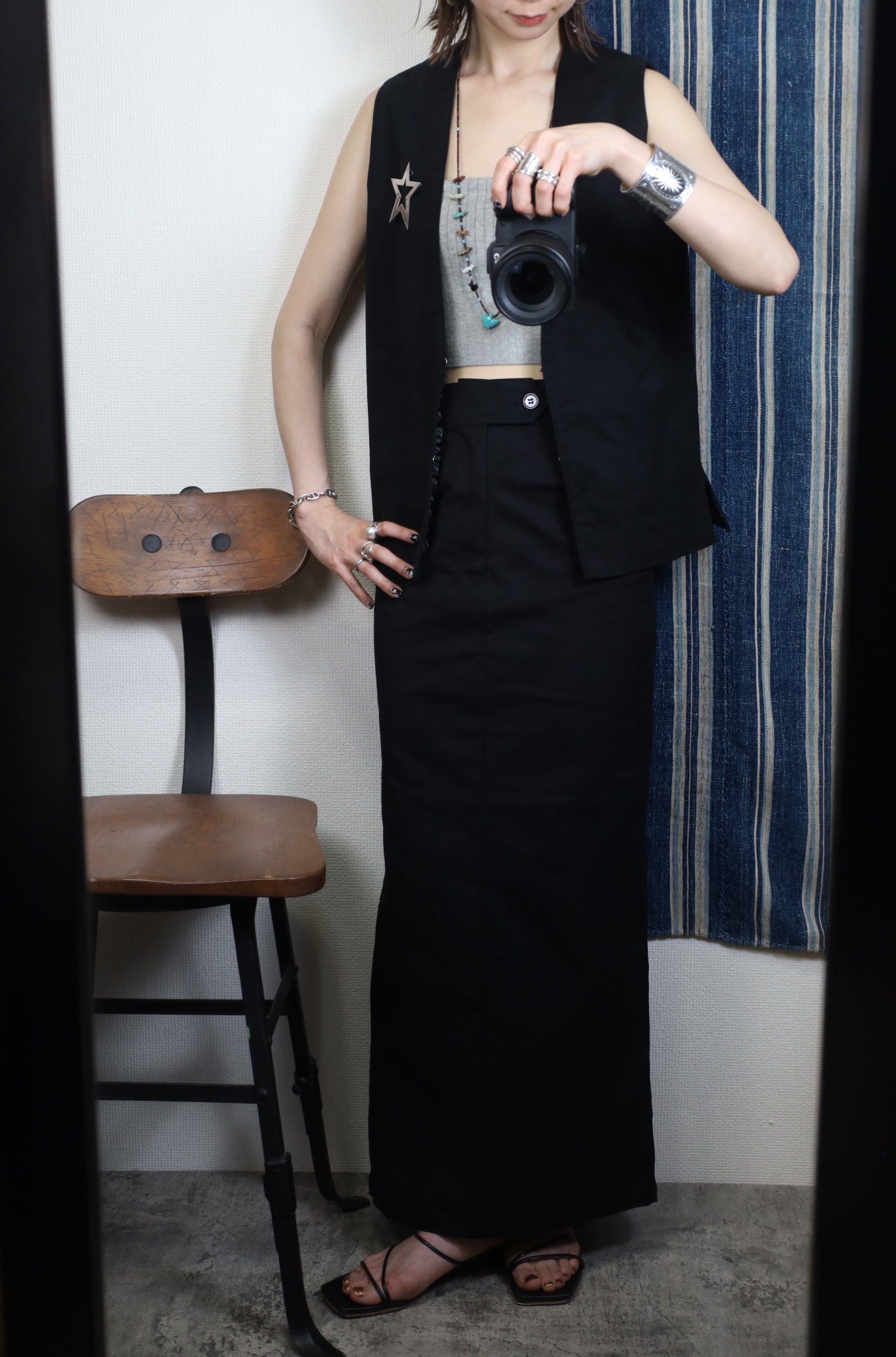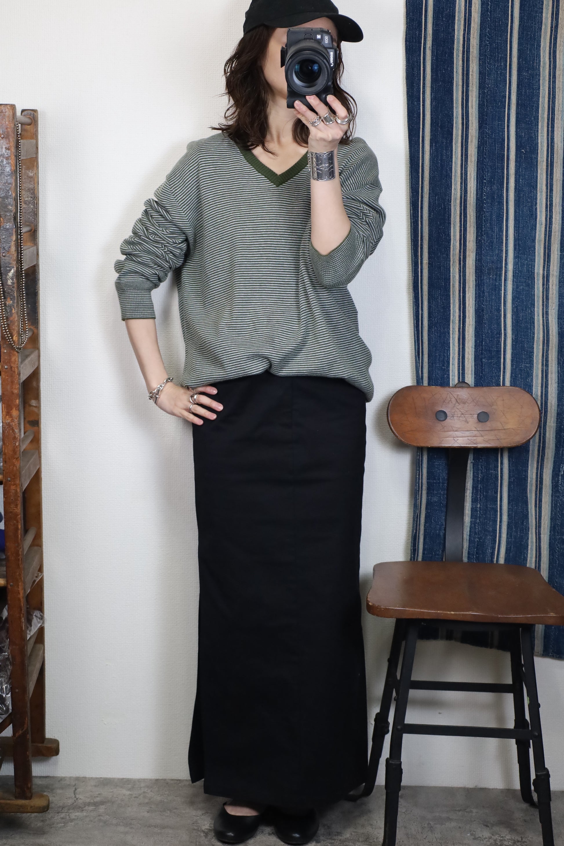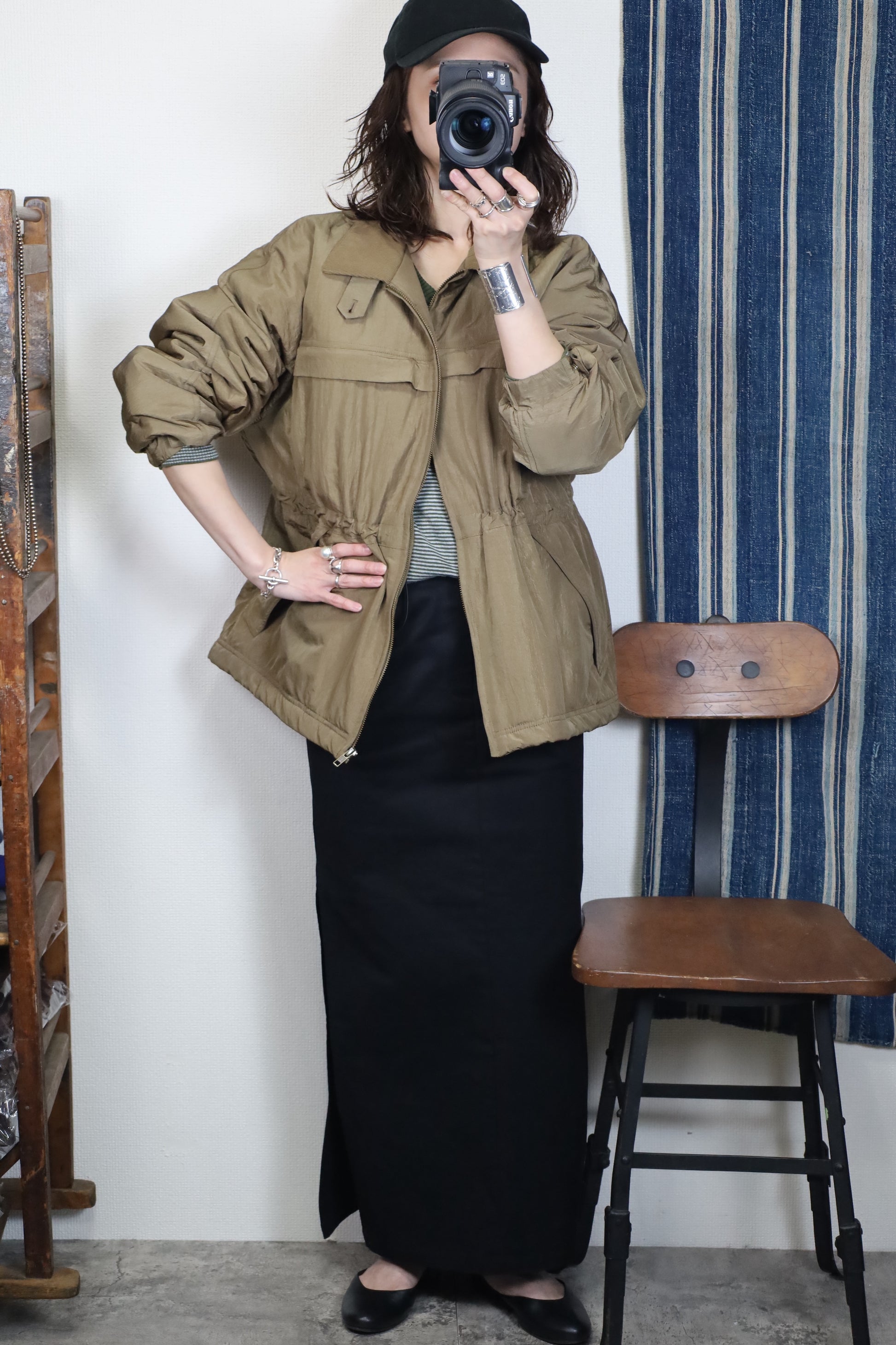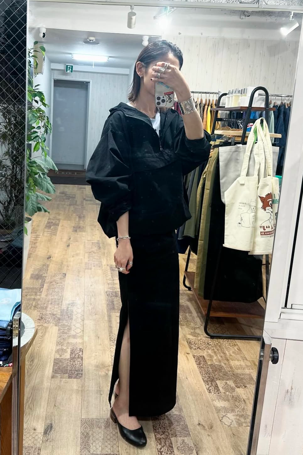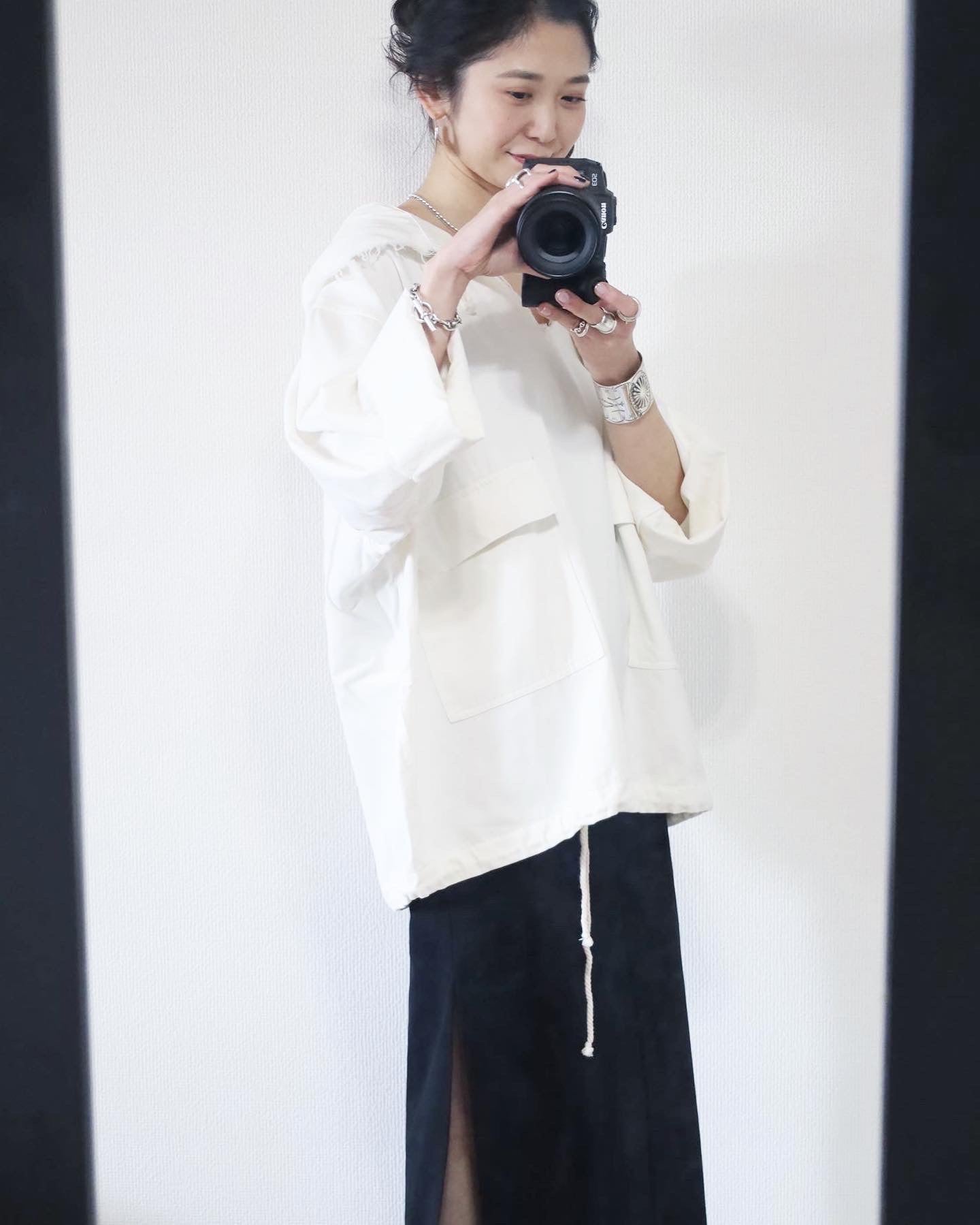 ウエストには4箇所ダーツを入れているので上から洋服をアウトしたスタイリングで